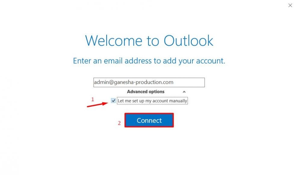 Cuando se abra la ventana, ingresa tu correo electrónico, elige la opción para ajustar tu cuenta manualmente y luego haz clic en Conectar.