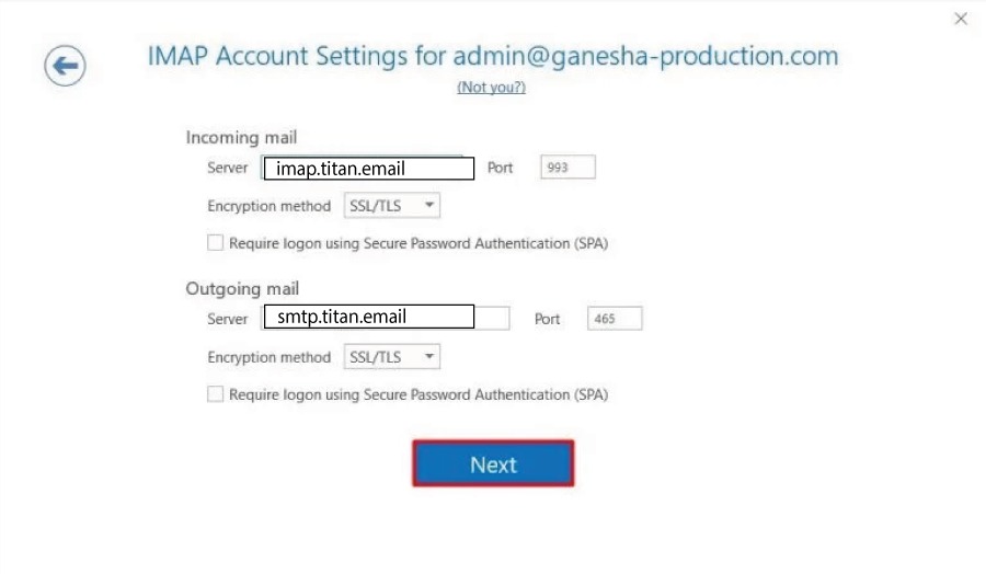 Ya sea que elijas POP o IMAP, completa los detalles correspondientes como puedes ver a continuación. Luego, haz clic en Siguiente para continuar.